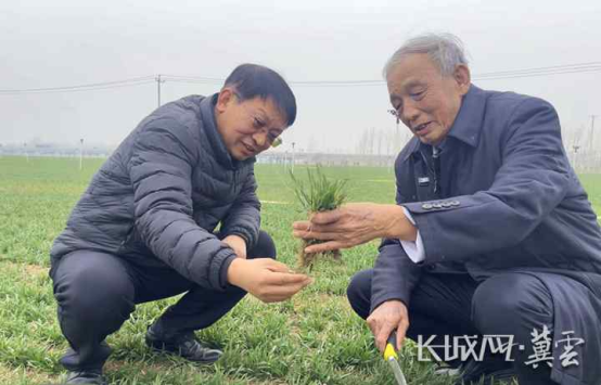 郭进考(右)向河北光耀农业服务集团的总经理李光耀讲解春季小麦管理技术要点。