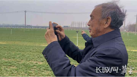 上午的查看在意犹未尽中结束。简单午饭后,郭进考又匆匆上车,奔赴下一站——定州。天色转阴,午后竟零星飘起了小雪。风尘仆仆的老人不顾疲累,下午又出现在定州市四新智慧农场的麦田里。细小的雪粒落在他花白的头发和肩头。