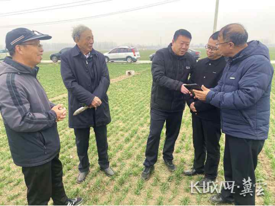 全国人大代表、河北省小麦专家指导组组长郭进考(左二)与保定市农业农村局相关工作人员一同察看当地麦苗长势。