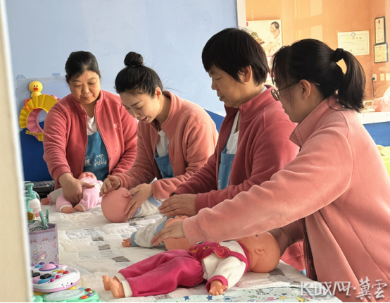 张青(左二)手把手教月嫂学习婴幼儿护理知识。