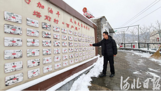 3月5日,兴隆县塔前村,村党支部书记王大龙在介绍村里的美丽庭院照片墙。