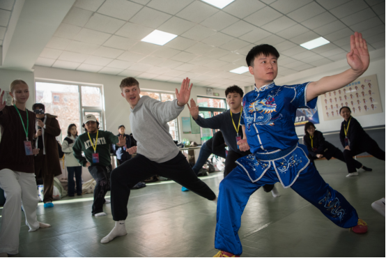 3月18日,美国艾奥瓦州青少年“友谊传承”研学团在石家庄外国语学校体验中国武术。