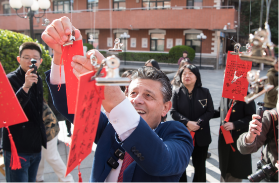 3月18日,美国艾奥瓦州友好人士卢卡·贝隆先生在石家庄外国语学校将心愿卡片挂在象征友谊的银杏树上。