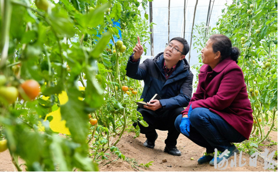 3月10日,河北兴芦农业科技集团有限公司番茄大棚,固安县气象局技术人员(左)在了解种植户的气象服务需求。