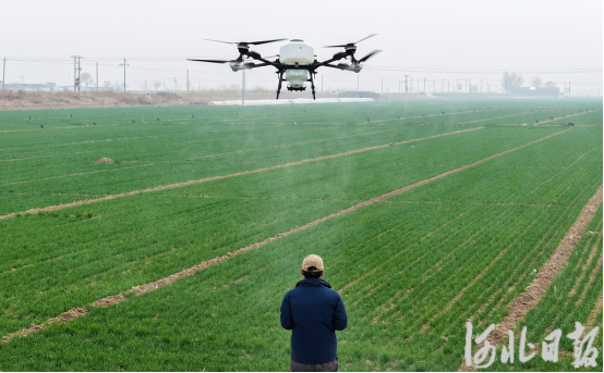 3月17日,宁晋县莹宇农业科技有限公司员工操作植保无人机为麦田喷洒除草剂。