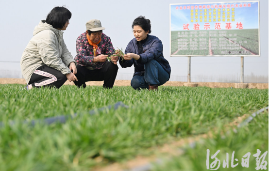 3月10日,国家小麦产业技术体系邢台综合试验站技术人员和农户(中)在南和区阎里村麦田查看苗情。