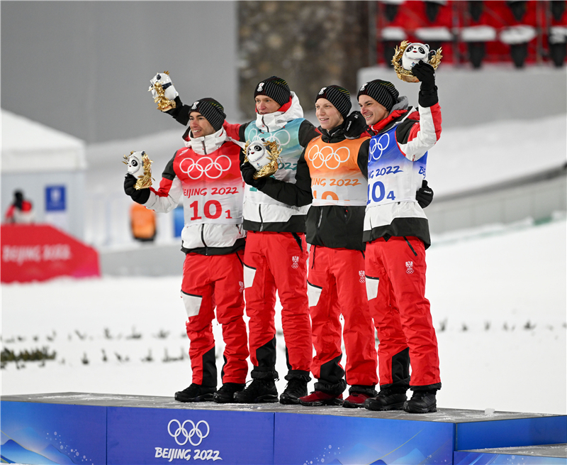 2月14日,奥地利队选手在颁发纪念品仪式上。当日,在国家跳台滑雪中心举行的北京2022年冬奥会跳台滑雪男子团体比赛上,奥地利队获得冠军。新华社记者冯开华摄