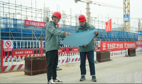 近日,在北京林业大学雄安校区第二组团一标段4号楼施工现场,工作人员正在结合施工图纸,研究建设工程细节。