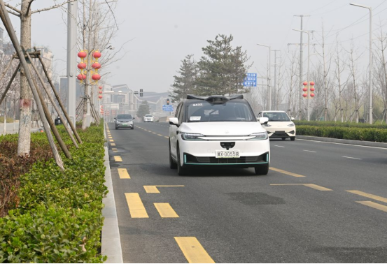 ↑一辆无人驾驶网约车在雄安新区容东片区街道上行驶(3月26日摄)。