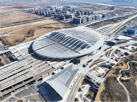 ↑这是京雄城际铁路雄安站(3月18日摄,无人机照片)。京雄城际铁路雄安站站顶分布式光伏电站总装机容量6000千瓦,站顶铺设1.77万块、4.2万平方米多晶硅光伏组件,电站采用自发自用、余电上网模式,自2020年12月正式并网发电以来,已累计发电超过3100万千瓦时。