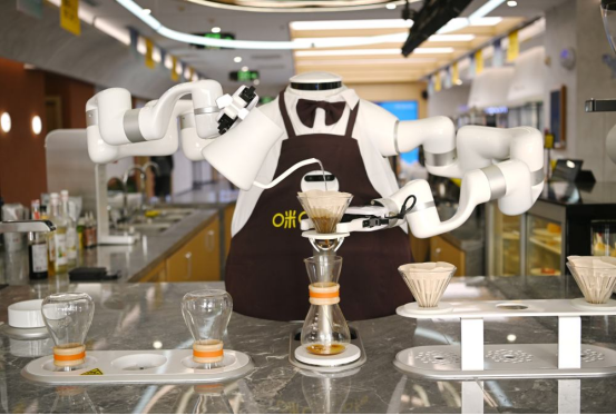 ↑在雄安商务服务中心一家咖啡馆,AI机器人在制作咖啡(3月25日摄)。