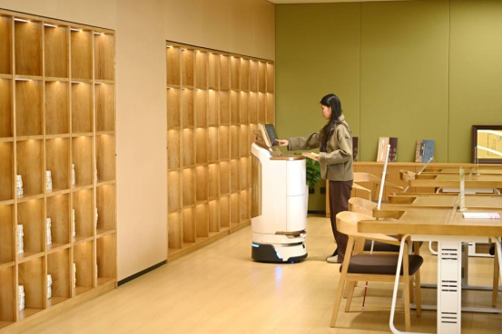 ↑市民在雄安图书馆体验智能送书机器人(3月25日摄)。作为雄安新区首个城市级公共文化地标,雄安图书馆以智能化服务,为读者提供便捷阅读的新场景。