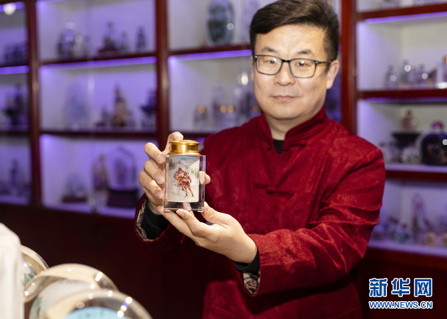 衡水内画艺人徐世博展示冬奥主题内画笔筒。陈康 摄