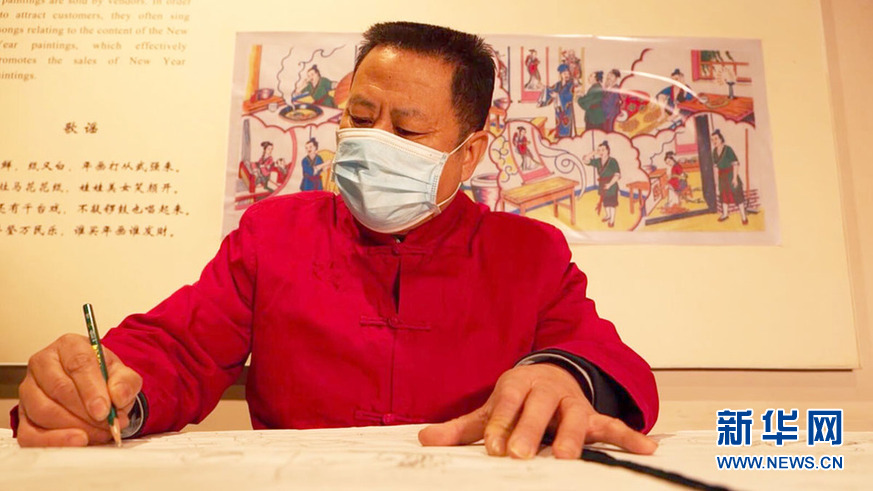武强年画艺人康英勤正在创作作品。黄静 摄