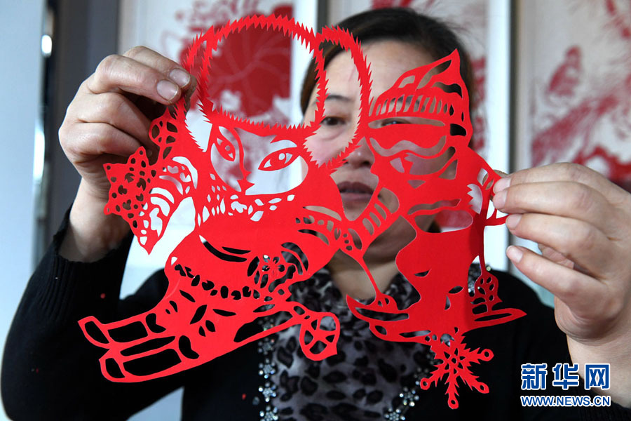 阜城剪纸艺人王淑芳展示她创作的剪纸作品。苗凤强 摄