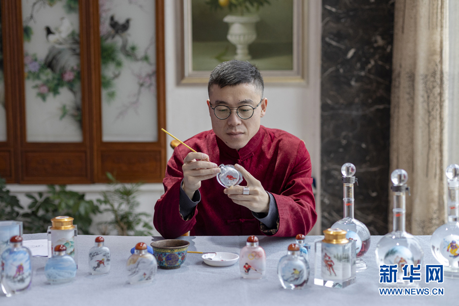 衡水内画艺人粘跃峰正在创作“激情冬奥”系列内画作品。陈康 摄