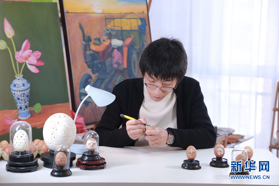 蛋雕艺人霍广健正在创作作品。吕明会 摄