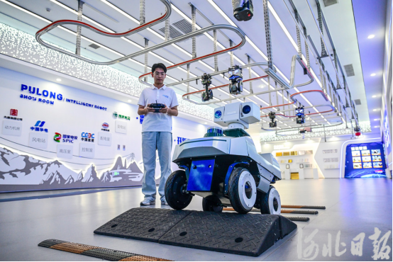 2025年7月31日,雄安科创中心中试基地,北京普龙科技有限公司员工对智能巡检机器人进行测试。