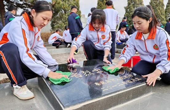 河北省秦皇岛市新世纪高级中学学生在秦皇岛烈士陵园擦拭烈士墓碑。通讯员曹建雄摄