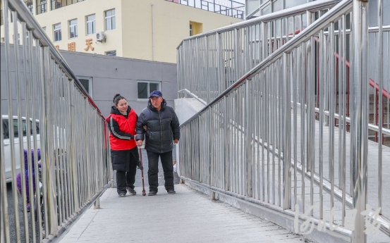 3月4日,秦皇岛市海港区吉星里社区,居民在改造后的单元门坡道上行走。