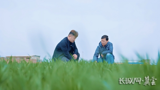 藁城区农业技术推广中心副主任李建波(右)在田间为小麦“把脉”。