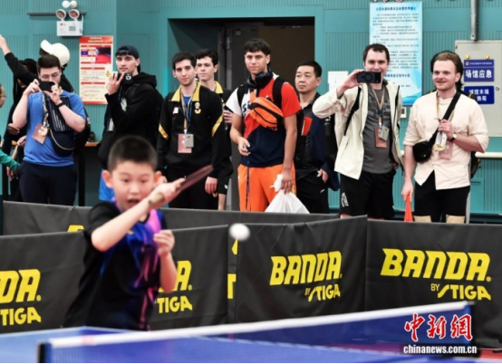 4月11日,河北正定国家乒乓球训练基地,中美青少年进行乒乓球交流活动。