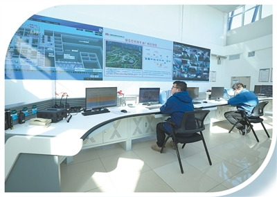 雄安新区容东再生水厂智慧调度中心里,工人在监测水厂运转情况。