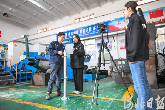 4月13日,位于邯郸市永年区的邯郸市浩盛紧固件有限公司生产车间,运营厂长程昊天(左一)在录制短视频。