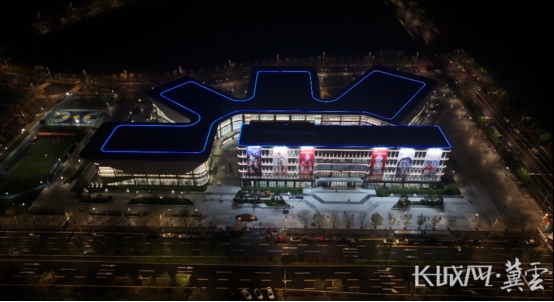 航拍雄安工人文化宫夜景。