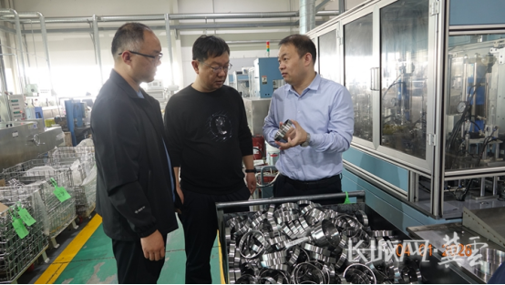 河北佳顺不锈钢轴承制造有限公司总经理张厚发(右)向河北省轴承学会、临西县科协相关负责人介绍轴承产品的性能。