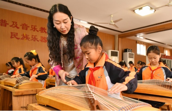 4月3日,在肃宁县融天小学,老师在国乐课上教授学生弹奏古筝。