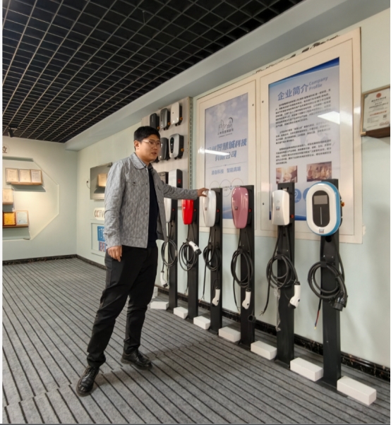 3月24日,沧州市青县经济开发区,沧州智慧城科技有限公司产品展厅,总经理柴明智在介绍充电桩产品。