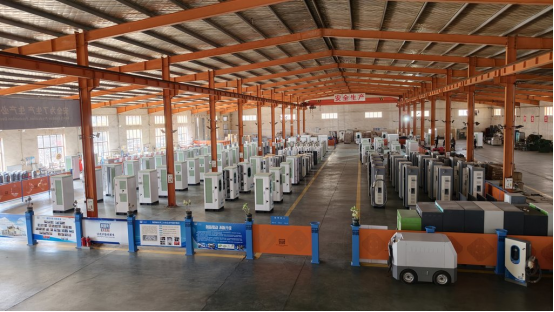 3月23日,沧州市青县经济开发区,沧州智慧城科技有限公司生产车间内,装配好的充电桩整齐排列。