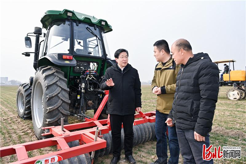 2月28日上午,省委书记、省人大常委会主任王东峰在石家庄,就春耕春管、农业产业化等工作进行调研检查。这是王东峰在位于石家庄市藁城区梅花镇的万亩小麦高产示范区,察看农机作业情况,与农机手深入交流。河北日报记者赵威摄