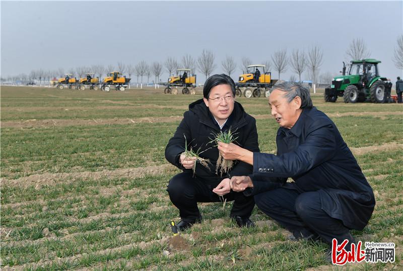 2月28日上午,省委书记、省人大常委会主任王东峰在石家庄,就春耕春管、农业产业化等工作进行调研检查。这是王东峰在位于石家庄市藁城区梅花镇的万亩小麦高产示范区,与农业专家郭进考一起走进麦田深处,查墒情、看苗情。 河北日报记者赵威摄