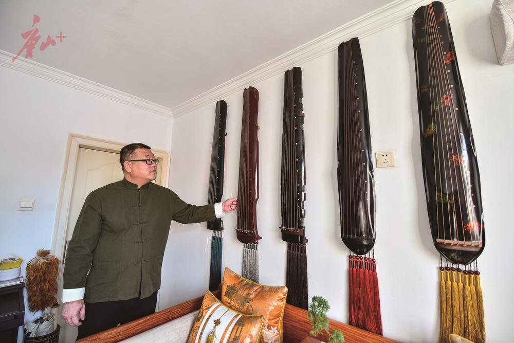 伏羲式“九霄环佩”琴、仲尼式“玉壶冰”琴、蕉叶式“蕉林听雨”琴……颜景春家的墙壁上,悬挂着多张他亲手斫制的古琴。谈起古琴艺术及斫琴技艺的历史,颜景春滔滔不绝。