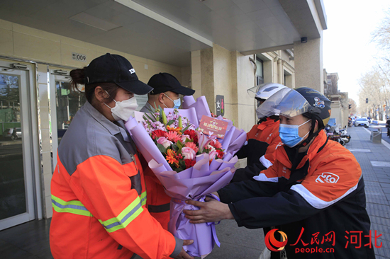 石家庄市环卫工人收到鲜花。 石家庄市委网信办供图
