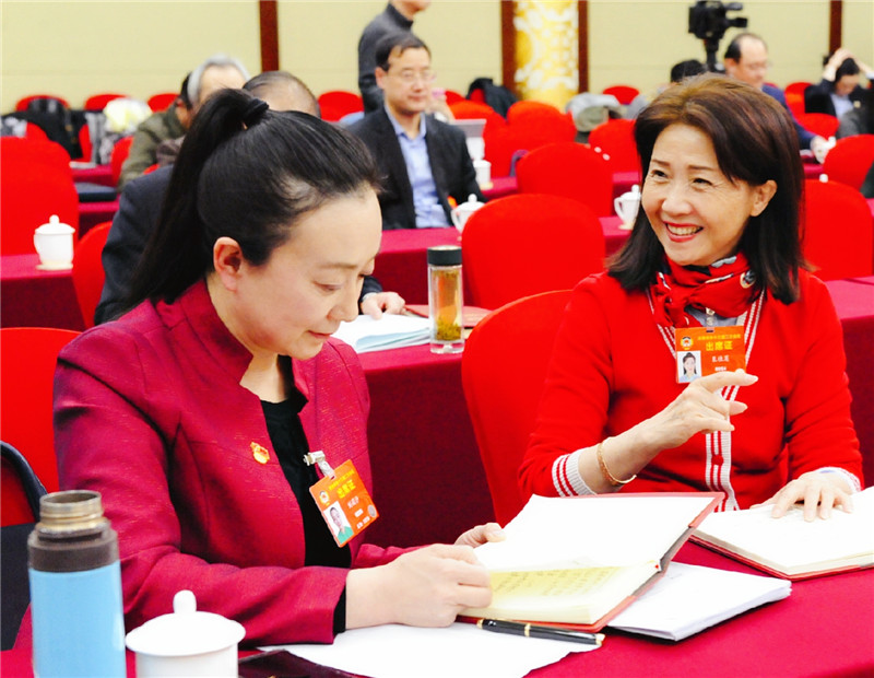 住冀全国政协委员刘莉沙(左)和委员们一起讨论政府工作报告。本人供图