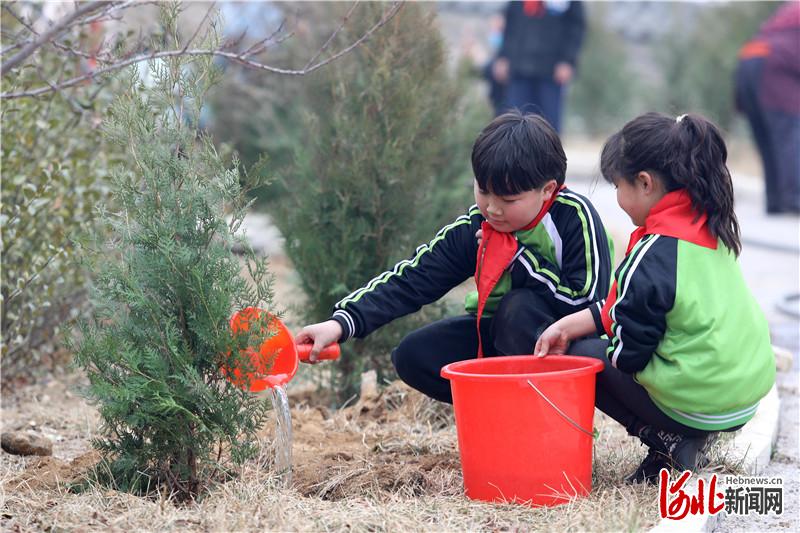 3月11日,在行唐县口头镇鲁家峪村,参加义务植树活动的学生们在老师和家长的带领下栽种小苗,培土浇水,扮靓春天。 新华社发(梁子栋摄)