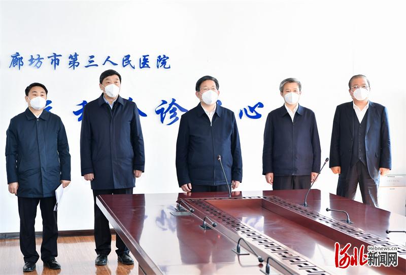 廊坊市人民医院东院区是该市防疫定点医院。王东峰来到该院远程会诊中心,通过视频与战斗在一线的医护人员连线,听取工作汇报,代表省委、省政府,向广大医护人员表示慰问和感谢。王东峰指出,疫情发生以来,广大医护人员不惧危险、逆行出征,做了大量卓有成效的工作,为保障患者生命安全作出了重要贡献。要坚持人民至上、生命至上,中西医结合、中西药并用,科学精准诊治患者,坚决防止发生病亡。要加强定点医院闭环管理,配齐配全医院防护设施,增强医护人员和患者防护意识,切实守住不发生院感底线。要严格执行患者出院规范,实行平行检测和血液化验、CT检查等措施,落实责任制度,衔接转入康复医院,确保安全万无一失。要关心关爱医护人员,科学安排轮岗轮班,加强服务保障,让医护人员以充沛的精力投入到工作中。