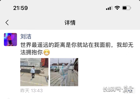 “世界最遥远的距离就是你就站在我面前,我却无法拥抱你。”最近,一条只有一句话和两张图片的朋友圈截图在各微信群里迅速转发,看到的人无不泪目点赞。