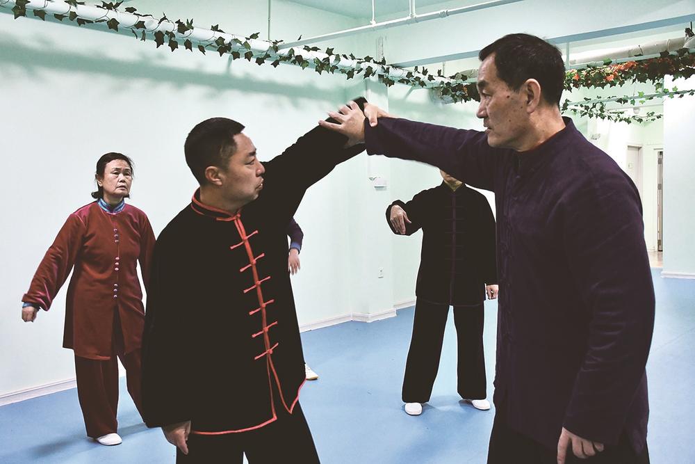 李文忠(右)示范姚式太极拳发力技法。记者 王欢 摄