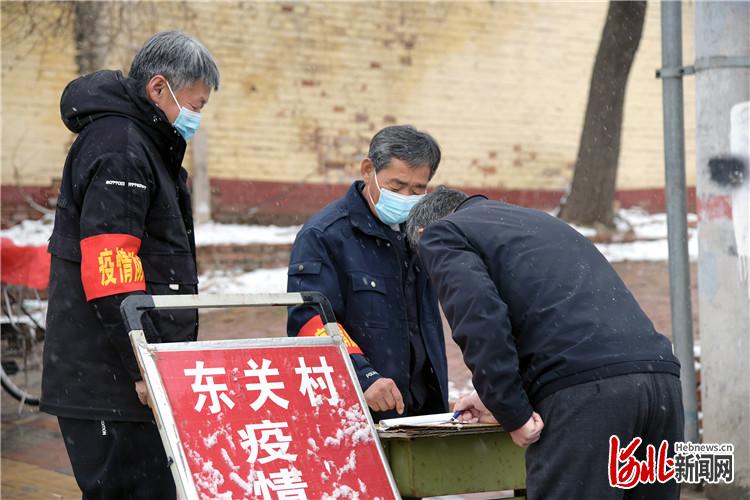 河北新闻网讯 (通讯员张炎、高丹钰)3月18日下午,一场大雪不期而遇,在漫天飞雪中,河北省廊坊市文安县各地各部门浴“雪”战“疫”,连续奋战在一线的“文安人”依旧坚守在疫情防控的前沿阵地。