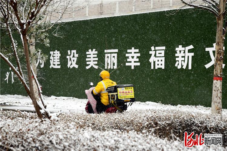 3月18日,在河北省文安县迎宾大道,外卖小哥正在冒着风雪送餐。高丹钰摄