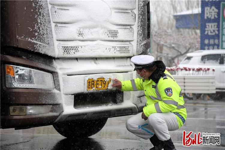 3月18日,在河北省文安县廊沧高速文安出口防疫卡点,交警为刚下高速的车辆擦扫车牌积雪。高丹钰摄