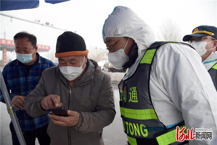 3月18日,在河北省文安县廊沧高速文安出口防疫卡点,交通局值守人员正在查看往来司机健康码、行程卡。高丹钰摄