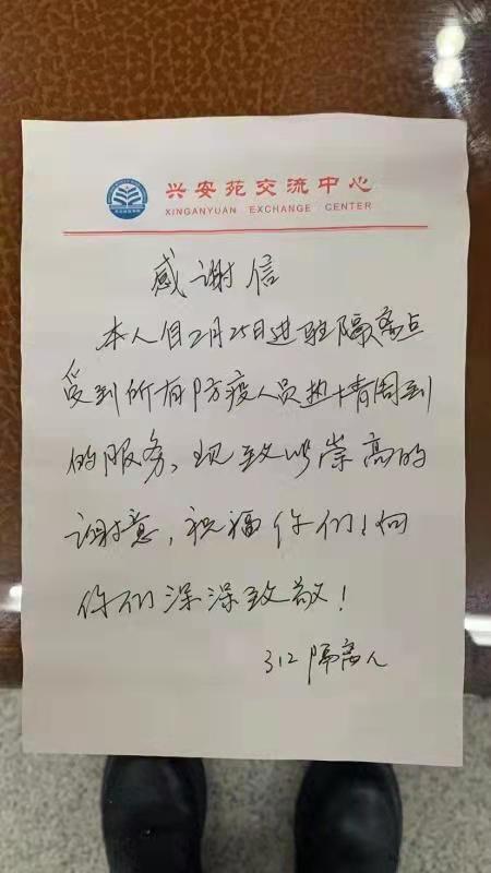 “本人自2月25日进驻隔离点,受到所有防疫人员热情周到的服务,现致以崇高的谢意,祝福你们!向你们深深致敬!312隔离人。”