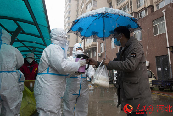 “辛苦了!喝点热水吧!”沧州当地居民为雪天里坚守的抗疫白衣工作者送去暖心的热水。 牛建才摄