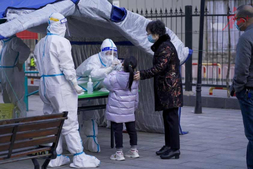 隔离服、隔离面罩、口罩……在国际花园社区,全副武装的“大白”有条不紊地为居民进行核酸检测。核酸采集现场,社区工作人员、志愿者有序引导,居民戴好口罩,自觉排队并间隔开1米的安全距离。当有上网课的学生来到现场,居民们多会善意地提醒:“不用排队,赶紧测完回去上课。”社区虽然只有一栋高层住宅楼,但核酸采集工作往往要大半天的时间。当一轮核酸采集工作完毕,“大白”的隔离面罩上已是水雾弥漫。一位中年居民采集完核酸,说:“我看到‘大白’的眼睛,她很年轻,还是个孩子,也是父母的宝贝疙瘩。疫情当前,他们战斗在一线,为大家的健康在付出、在战斗,咱们更得配合工作,不给他们添乱。”