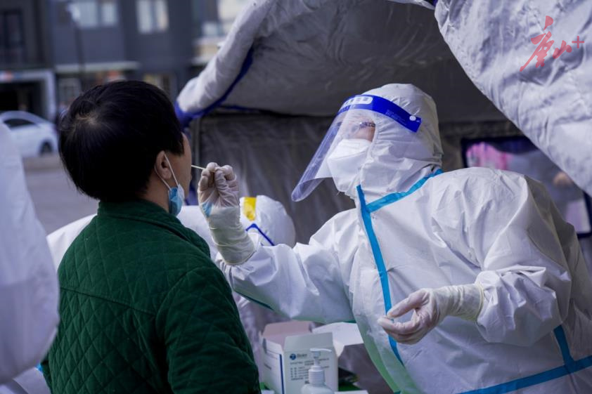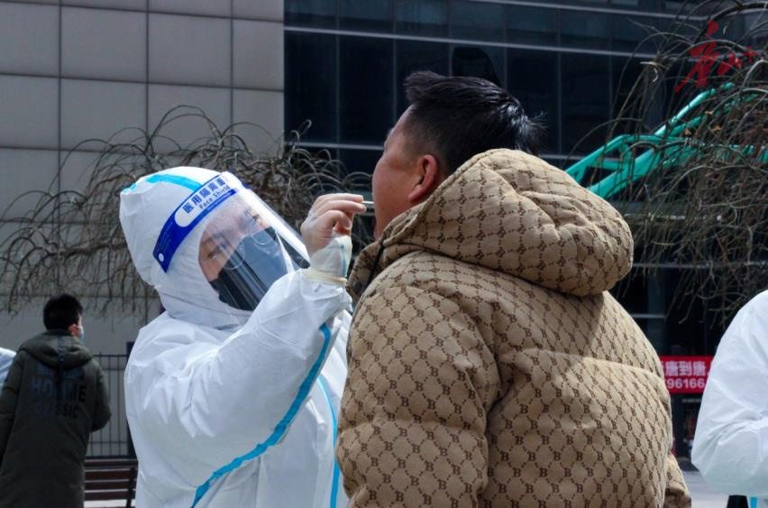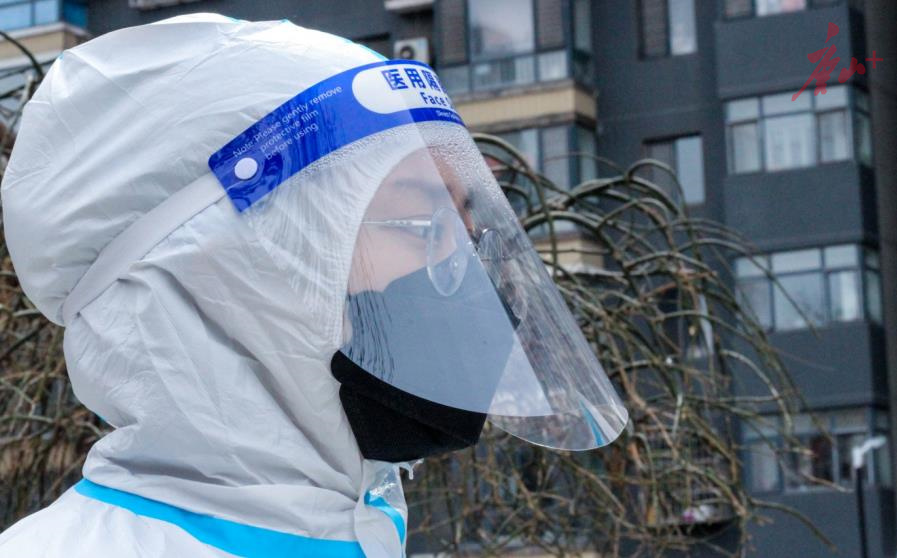 采集核酸的“大白”,面罩凝结了一片水滴。